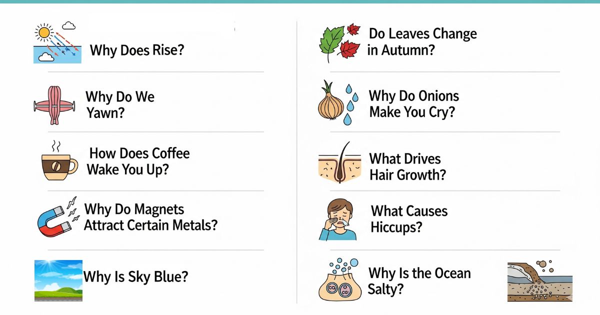 Life is full of everyday phenomena that spark curiosity—from the blue sky above to the aroma of morning coffee. While these moments may seem ordinary, they carry fascinating scientific explanations that connect us to the hidden mechanics of nature. Here, we’ll break down common science questions with clear, simple explanations, helping you uncover the science facts behind daily life mysteries. Whether you’re eager to expand your knowledge, share fun trivia with friends, or simply enjoy learning the scientific reasons behind ordinary events, this guide will make the world around you even more exciting.